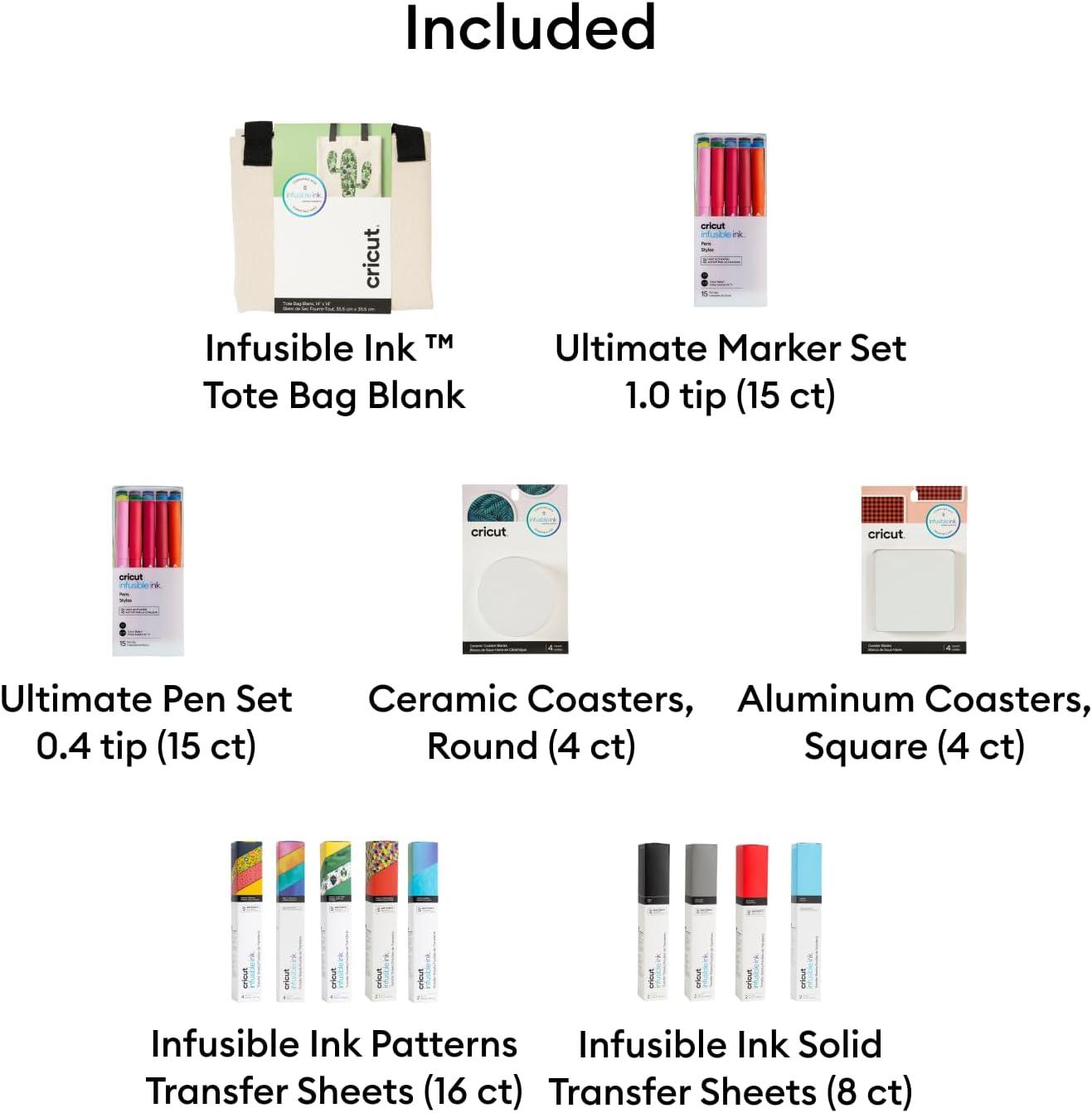 Bundle includes 24 Infusible Ink Sublimation Sheets (patterned & solid), 1 Infusible Ink Pen Set, 1 Infusible Ink marker set, 8 Blank Coasters & Blank Tote Bag