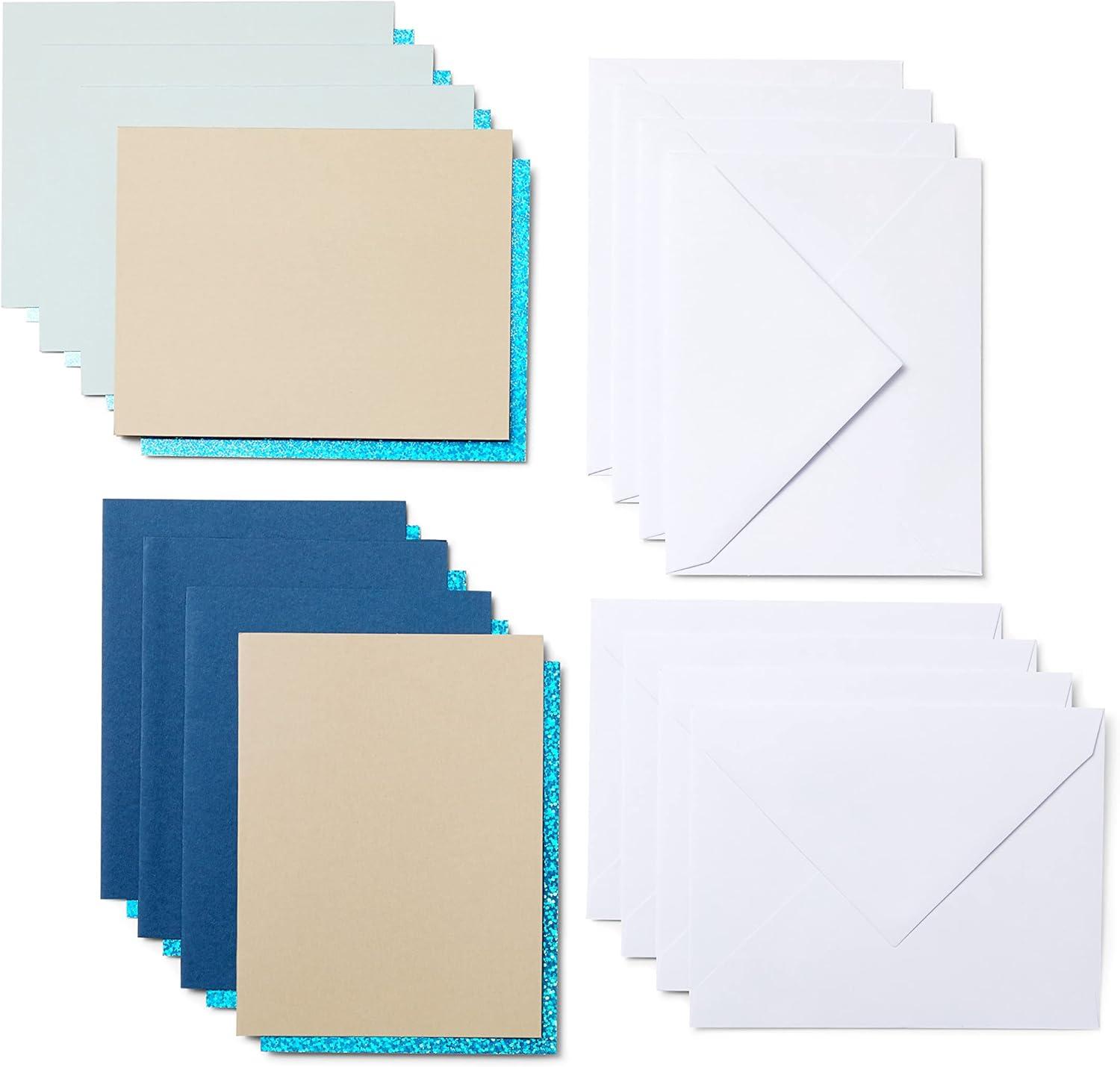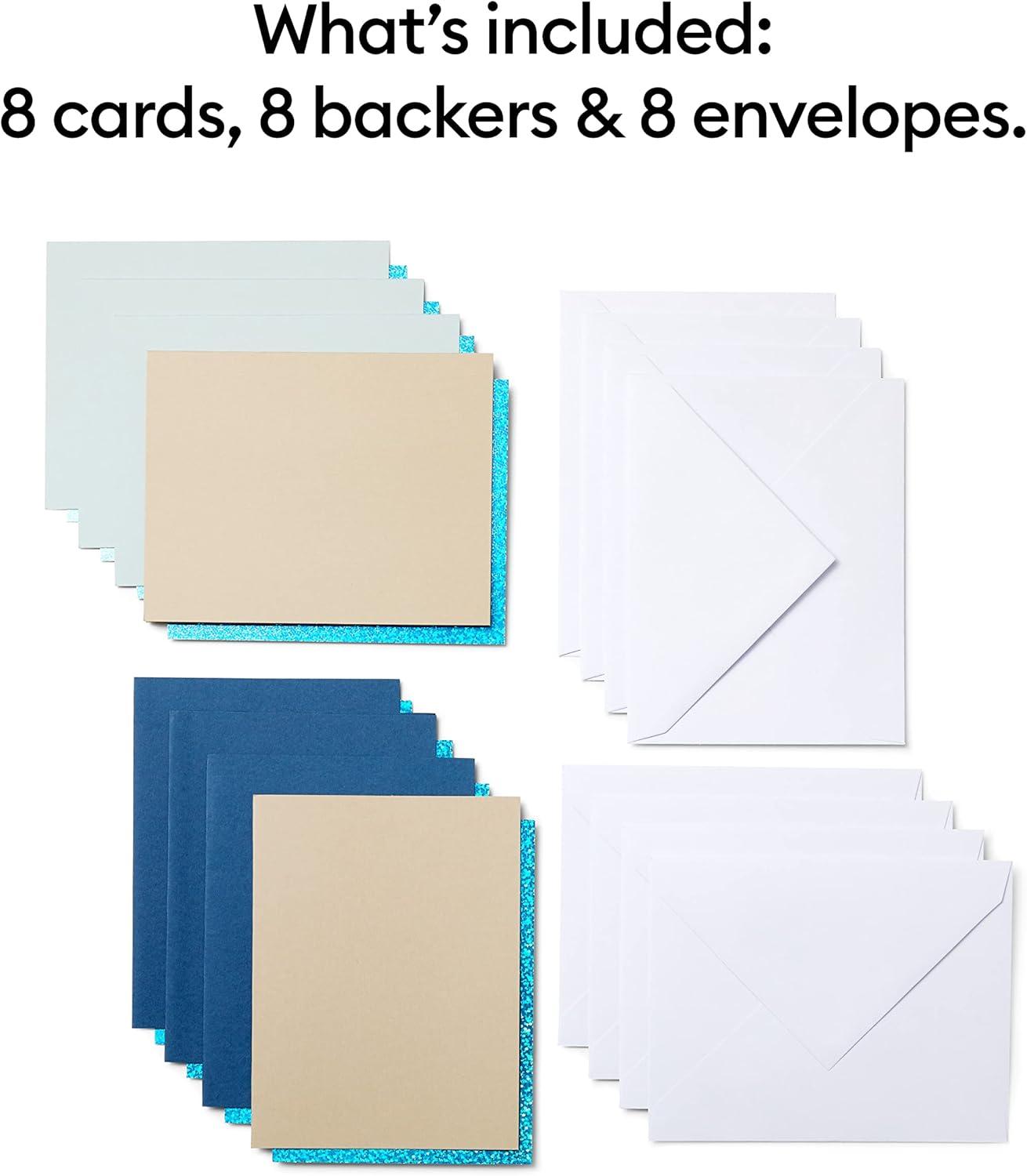 8 cards with adhesive (3 Midnight Blue, 2 Khaki, 3 Whispering Blue); 8 Blue Holographic backers; 8 White envelopes