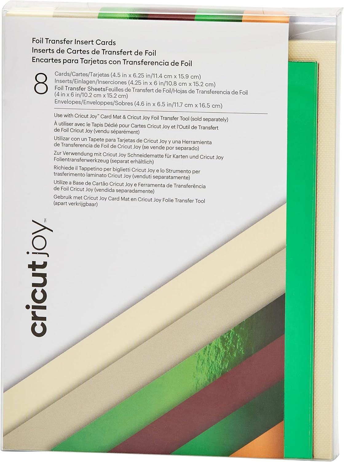 Create meaningful greeting cards that shine in no time with Foil Transfer Insert Cards for your Cricut Joy™ cutting machine. Each cut will reveal the hue of the insert inside. This ingenious glue-free design allows for two-tone, depth-filled cards without the hassle or mess of glue. Add amazing shimmer and shine to your card designs with included Foil Transfer Sheets. This set includes envelopes and comes in an wide range of colors to please every card recipient on your list! For use with Cricut Joy. Requires Cricut Joy Foil Transfer Tool and Cricut Joy Card Mat (sold separately).