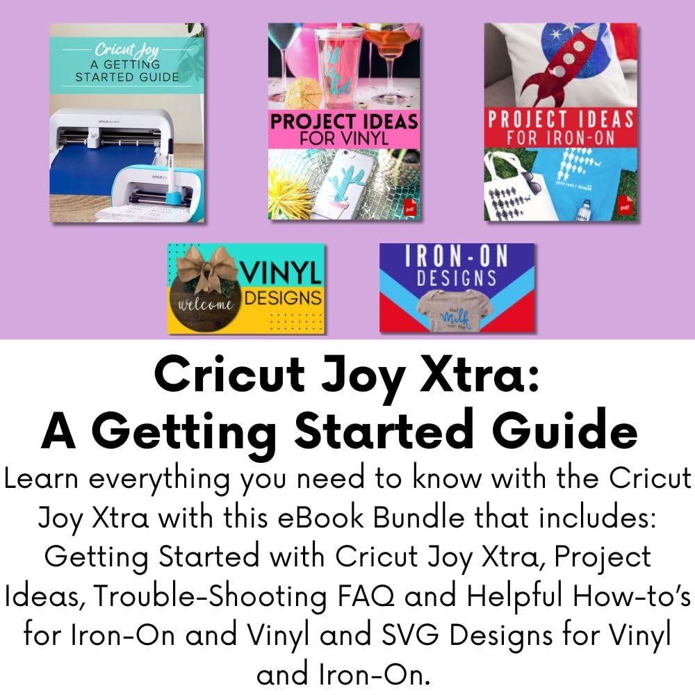 BUNDLE INCLUDES: 1- Cricut Joy Xtra Machine, 1- Cricut EasyPress Mini Heat Press, 1- Joy Xtra Smart Iron-On Vinyl Sampler (colors may vary), 1- Joy Starter Tool Set, Joy Digital eBook Guide (Print copy unavailable), and Project Ideas for Iron-On Project eBook Guide and Digital Designs (Print copy unavailable)