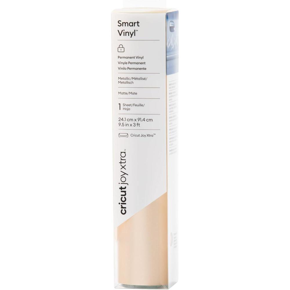 Cricut Joy Xtra Smart Vinyl Matte Metallic Permanent. Create DIY projects like a pro with the Cricut Joy Xtra Smart Permanent Vinyl – Matte Metallic a perfect long-lasting transfer vinyl that works without a cutting mat with the Cricut Joy Xtra machine and brings your crafts to life without getting worn out over time. Easily transfer your designs, labels, decals, and stickers onto finished custom-decorative items. Just cut the pattern/figure stencil on the smart vinyl, weed away the excess, transfer it onto the transfer tape (sold separately), press down on the object of choice, and burnish it with a scraper or credit card. Voila! Your design transfers seamlessly, and permanently, onto the object. The 9.5 in x 3 ft (24.1 cm x 91.4 cm) smart vinyl is easy to use and can transfer even the most intricate designs to smooth, non-textured surfaces with ultimate precision. Be it creating vinyl stickers for your mugs, cups, and bottles, signs for your home and car, making custom labels for the kitchen, or even for outdoor use. The smart permanent adhesive vinyl for Cricut Joy is all-weather resistant, dishwasher friendly, fade-proof, and water and UV-safe so you can wash your mugs/containers multiple times and your vinyl design will still stick around.