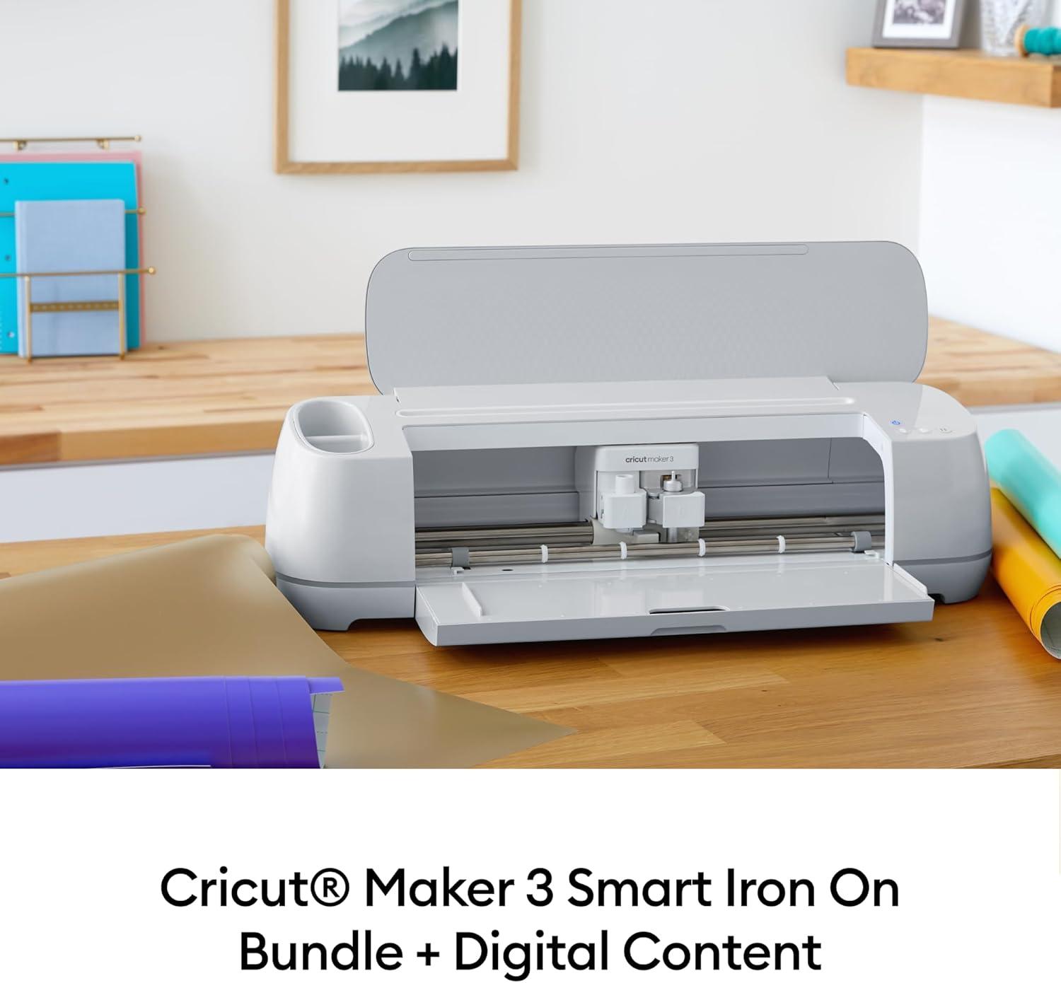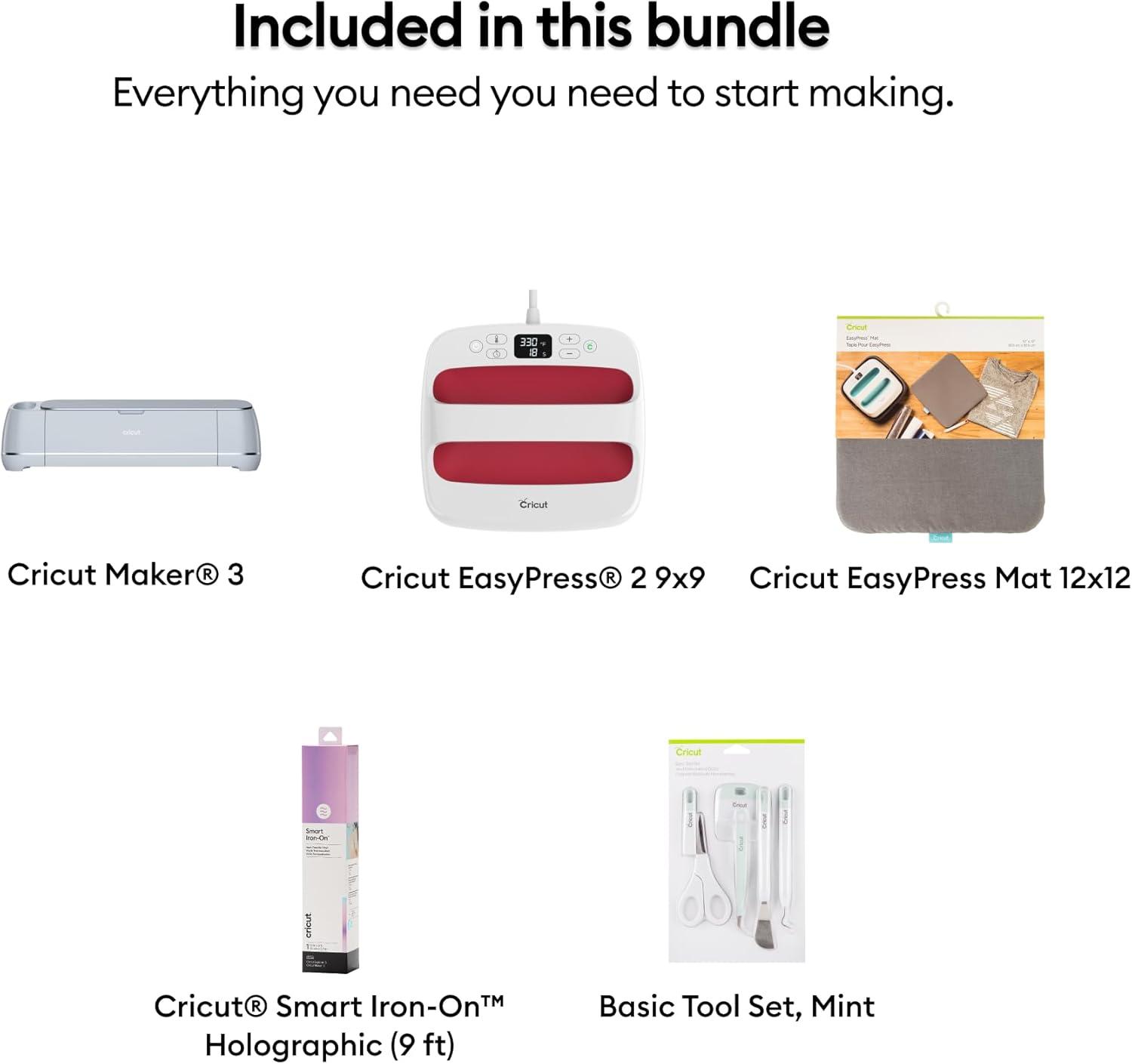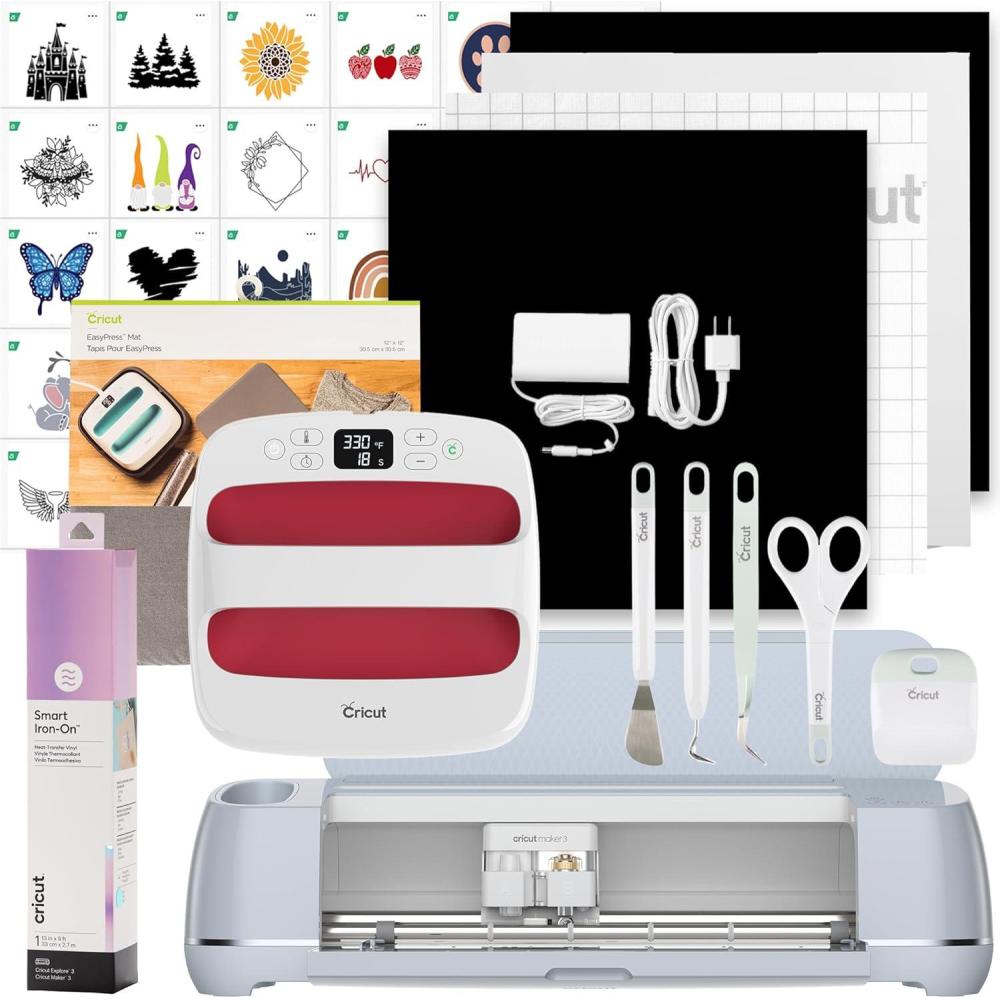 MATLESS CUTTING TO START YOUR IRON ON PROJECTS – The set includes the Maker 3 Smart Machine, 30 images of digital content, EasyPress 2 Heat Press, EasyPress Mat, 5-Piece Tool Kit, & Smart Iron-On Vinyl Roll (Blue)