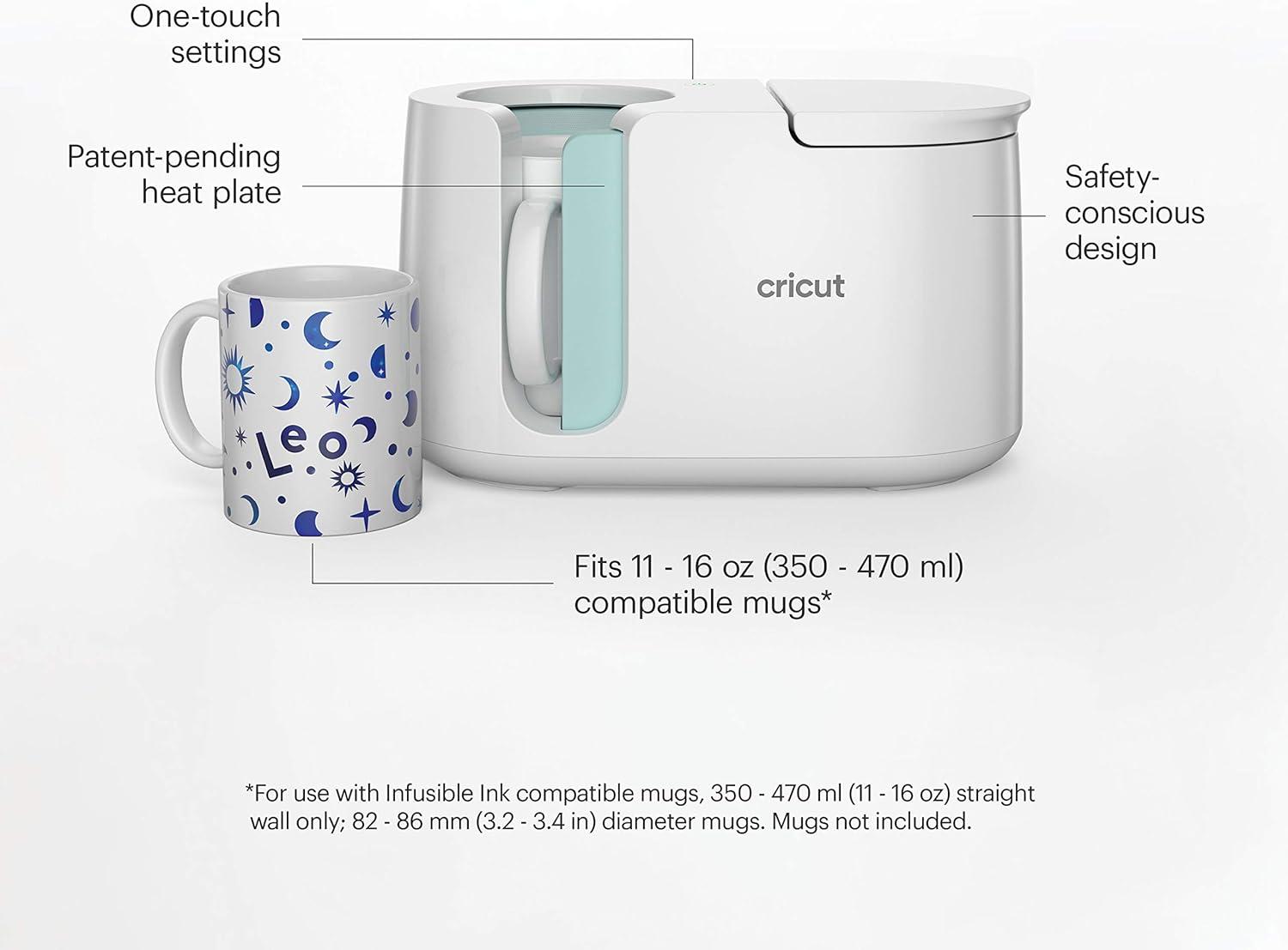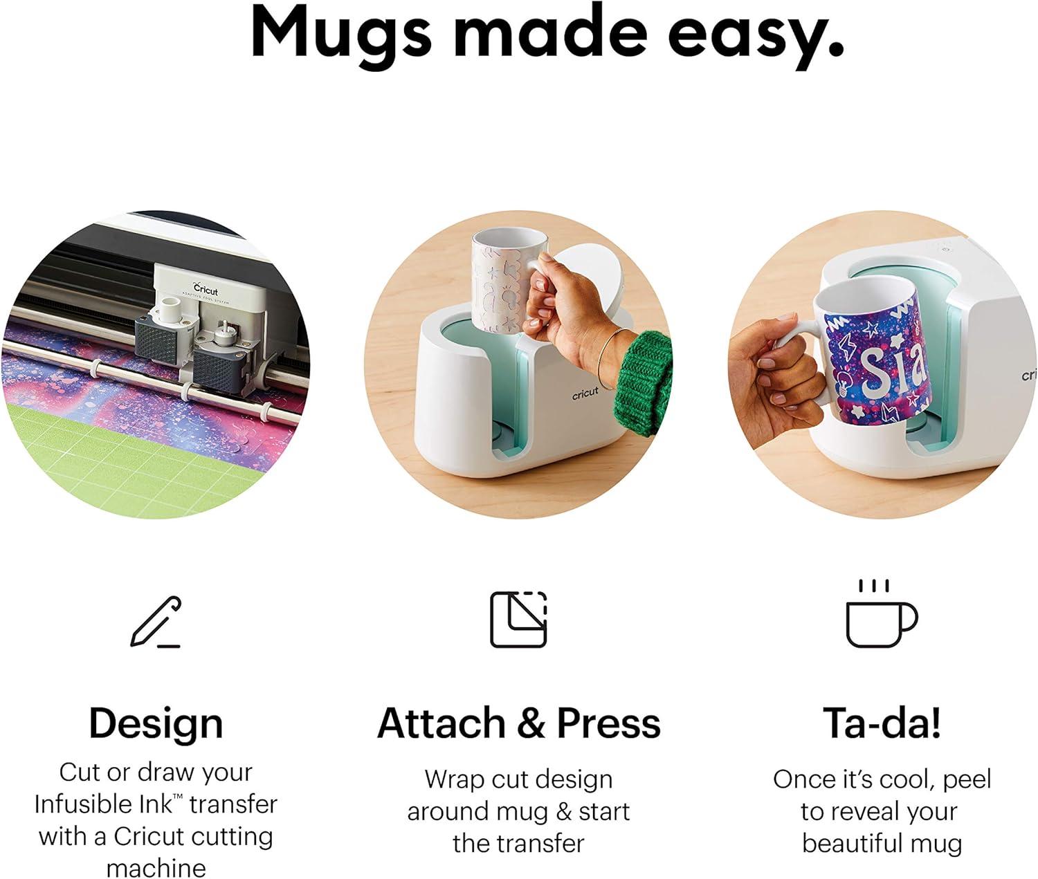 Give the gift of vibrant, professional-quality personalized mugs with the heat press designed for mugs and an assortment of mug-making essentials. With Cricut Mug Press™, just create your design using Cricut Infusible Ink® materials, attach it to your mug, then let the press do the rest! With no manual temperature or pressure settings, it's easy to customize Infusible Ink-compatible mugs* with one-of-a-kind art or text. Patented heat plate technology with zone heating creates excellent, consistent results. Perfect gifts for family, friends, teachers, neighbors, and coworkers have never been this easy. Optimized for Infusible Ink products, this unique mug press is the perfect complement to any Cricut® cutting machine. Kit includes Cricut Mug Press and Cricut Mug Blanks. Carefully follow instructions at cricut.com/make-mugs. Adult use only. Use in well-ventilated area. Vapor emitted during heat transfer. See cricut.com/help/infusible-ink-warning