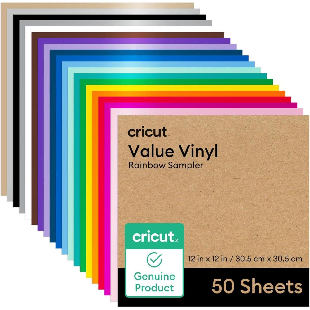 Customize with confidence! With Cricut Value Vinyl, you can DIY personalized decals, labels, and so much more. The sampler includes 50 sheets with a range of colors to help bring your most vibrant ideas to life. Cricut Value Vinyl is permanent yet removes without residue, weather- and fade-resistant, and dishwasher friendly*. It has a plastic PET backer for a frustration-free mat experience. Engineered to reduce packaging and pass on the savings, Cricut Value materials deliver all the benefits of the brand you know and trust. Optimized for Cricut cutting machines.